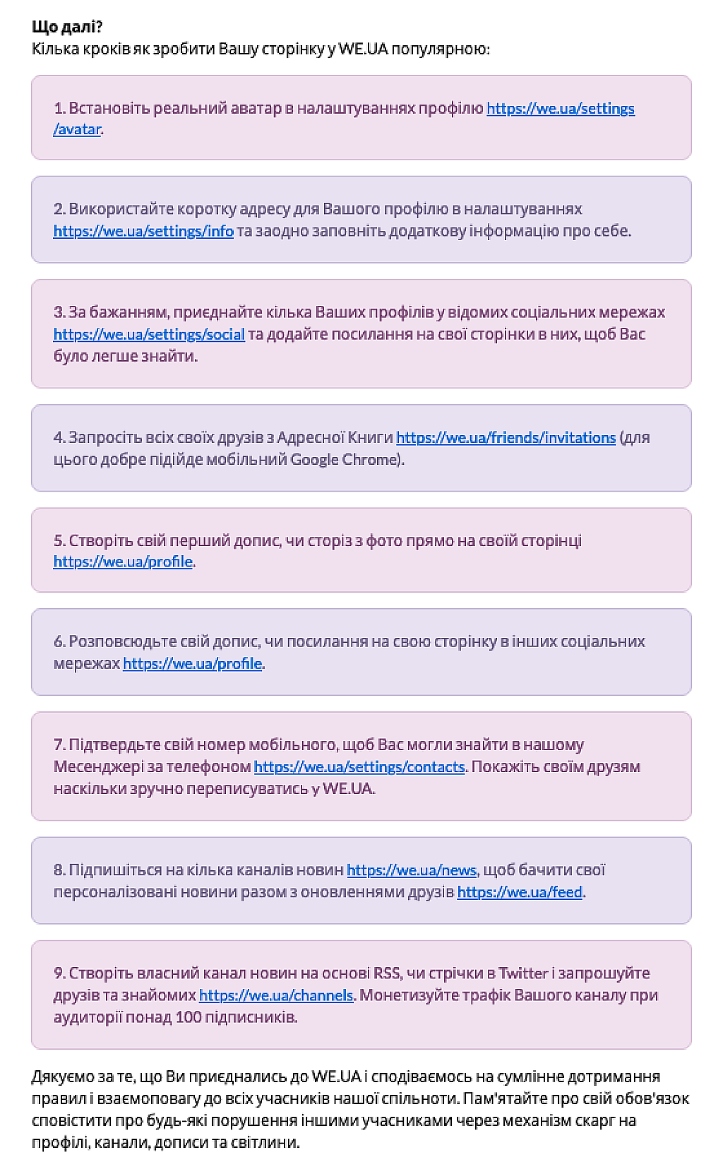 У випадку, якщо введені дані правильні і відповідають вимогам безпеки, Вас буде спрямовано на форму Входу, а на вказаний Email буде надіслано вітальний лист з 9 кроками-рекомендаціями як зробити свій профіль на weua.social успішним та популярним.